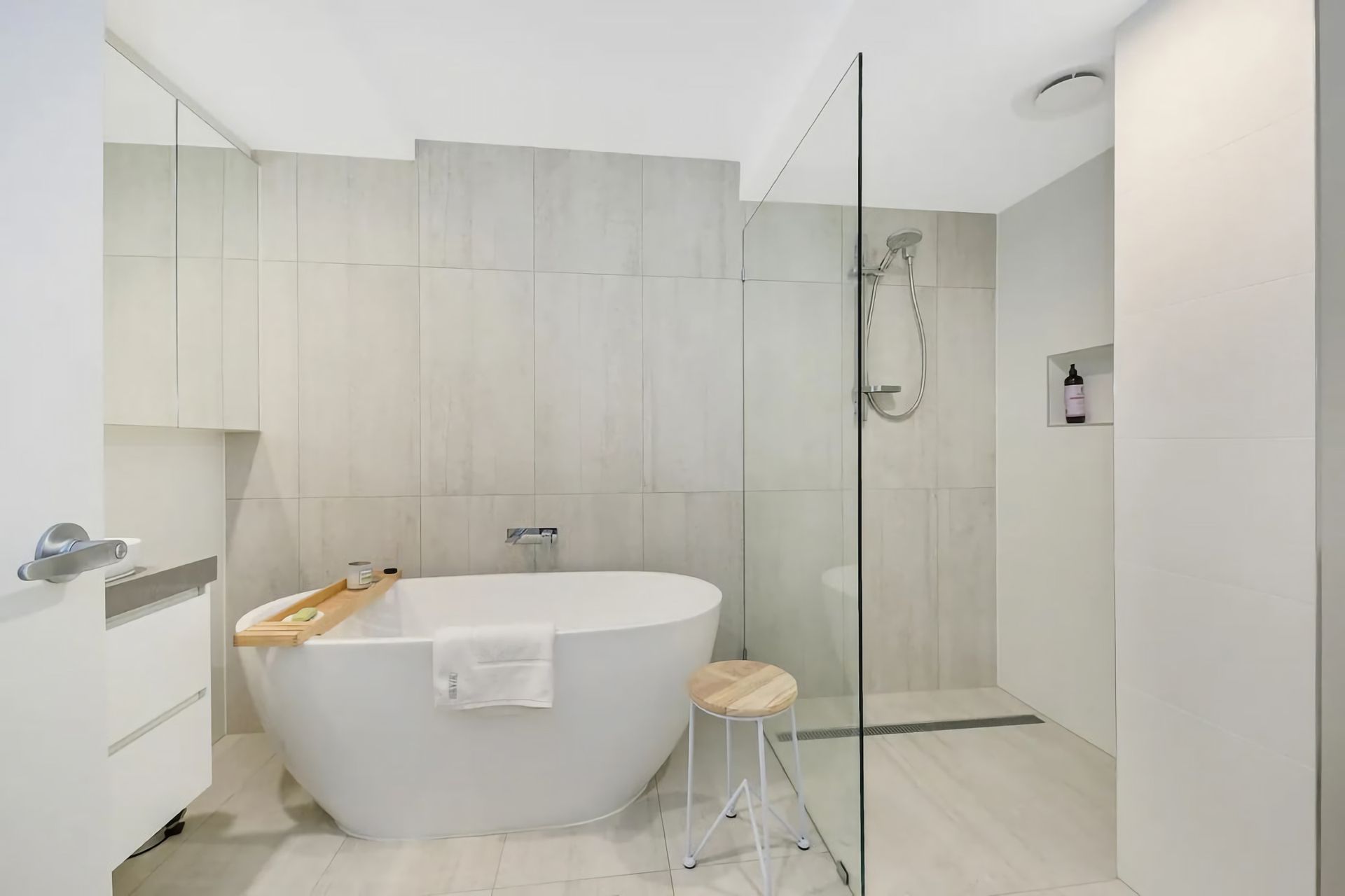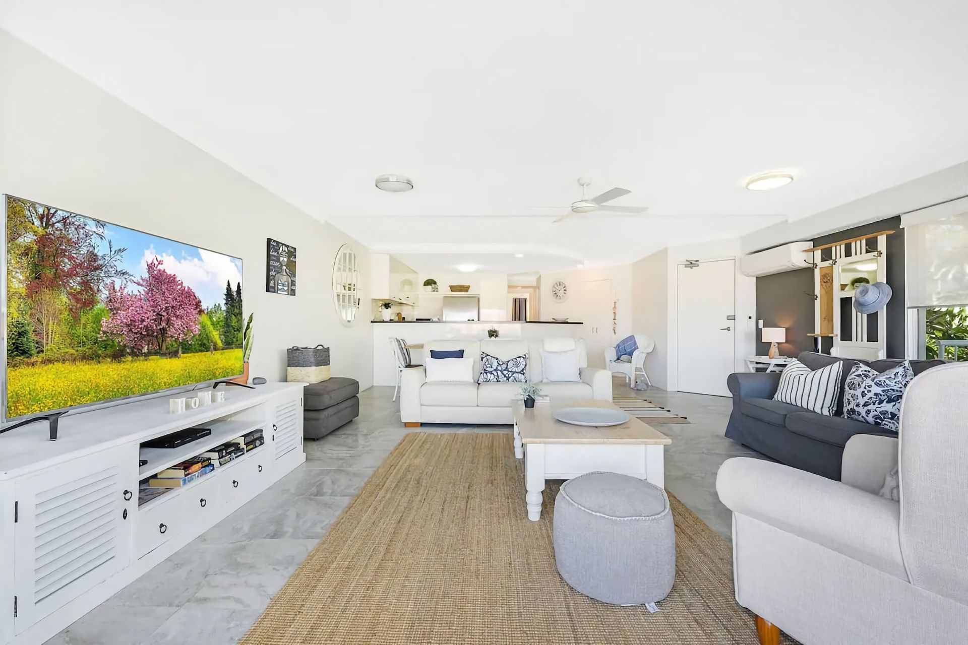 The Master Bedroom suite contains a spacious walk-in robe and ensuite, smart television, air conditioning and a leafy private balcony. The second air-conditioned room has built-in robes, drawers, block out blinds, security screened window and a leafy outlook. A selection of DVDs, books, board games and pool toys are available for guest's use during the stay. An undercover car parking space is available in the unit's garage. This property is located on the second floor and no lift is available. Guests will need to be able to manage two flights of stairs to reach the unit. The apartment is not suitable for infants/children between the ages of 9 months and 6 years of age due to the location and balconies.